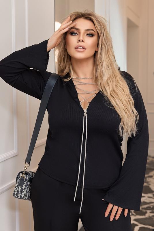 Матеріал: трикотаж в рубчик. Хорошої розтяжності . Декольте декоровано шнурівкою зі стразами Сваровскі, якою можна зробити декольте менше або глибше. Розміри : 42-46, 48-52, 54-58, 60-64 Вимірювання: 42-46: довжина від талії 45 см. ОГ 78-90, ОБ 84-106, ОТ 57-78 48-52: ОГ 98-108, ОБ 106-116, ОТ 78-90. от довжина від талії 51 см. 54-56: ОГ 108-118, ОБ 114-126, ОТ 85-100. довжина від талії 51 см. 58-60: ОГ 116-125, ОБ 124-138 вол