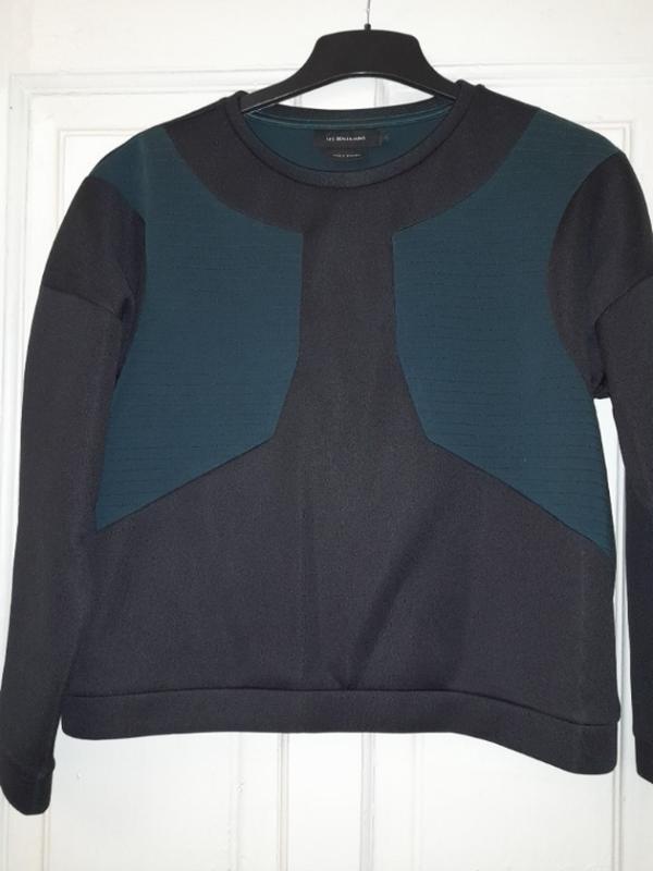 Интересный джемпер, качественный.Ведомый турецкий бренд LES BENJAMINS streetwear одежды. Хорошо принимает объем фигуры. Этикетка о составе отсутствует, на ощупь темно-зеленые вставки -хлопок,черный - полиамид. Есть нюанс-острая фото, в носке едва заметно.Это внутренний шов рукава снизу. По плечах - 40 см. По грудях ширина-55 см. Длина изделия- 56 см. Длина рукава- 54 см