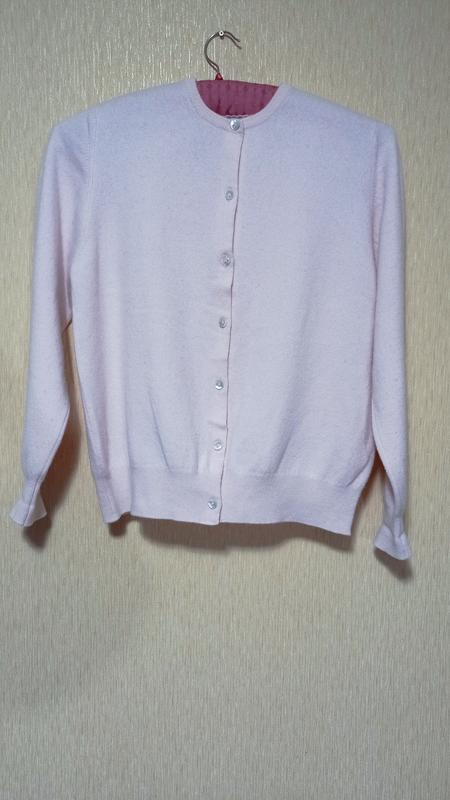 Дуже ніжна і якісна кашемірова кофта, розмір 42, колір приємний світло-рожевий. Ґудзики - перламутр. Стан - прекрасний, ніяких вад нема. Заміри - плечі - 40, рукав - 61, ширина - 56, довжина - 62.