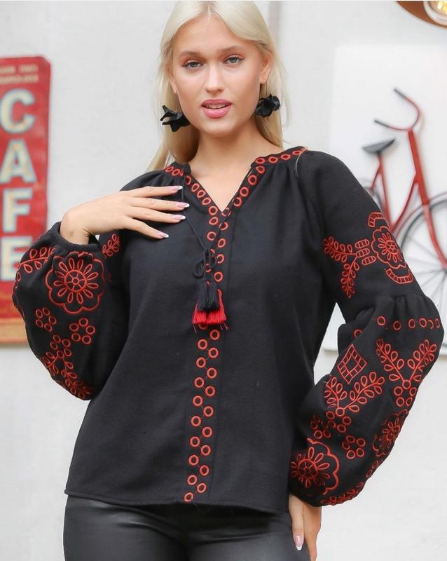 Ця чорна вишиванка із червоним орнаментом має широкі рукави і виготовлена з теплої тканини фліс. Орнамент розташований на грудях та рукавах, додаючи образу вишуканості і стилю. Широкі рукави надають комфорт та зручність, а теплий фліс забезпечить відмінне тепло у холодну погоду. Ця вишиванка ідеально підійде для стильного та затишного образу в холодну пору року. #muhteshem100