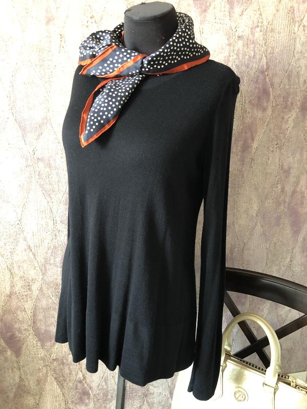 Колір темно-синій, на межі чорного. Тканина тоненька, приємна до тіла. По низу 13 см двійна, за рахунок чого, а також того, що джемпер трошки розклешоний, чудово лягає по фігурі! Довжина 68 см, напівобхват грудей 54+ см.
