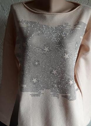 Интересная модель кофты, персикового цвета, со спущенными плечами, Передняя часть украшена стразиками.ПОГ 56, Длина по спинке 68 см.Теплёнка, хорошего качества. Состав на фото 4.Кофта новая, но стираная, из витрины. Стан идеален.