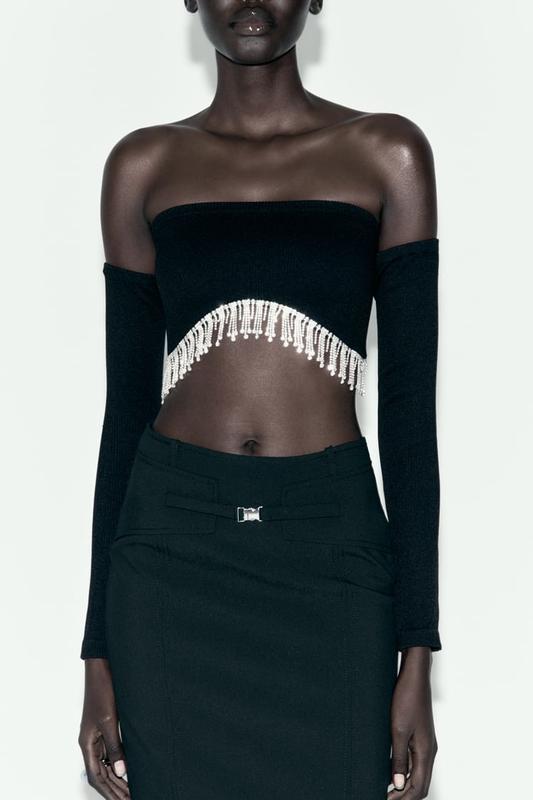 Укороченный топ ZARA без плеч с прямым вырезом. С длинными рукавами, подол с металлической бахромой и аппликациями со стразами. Размеры XS/S и M/L