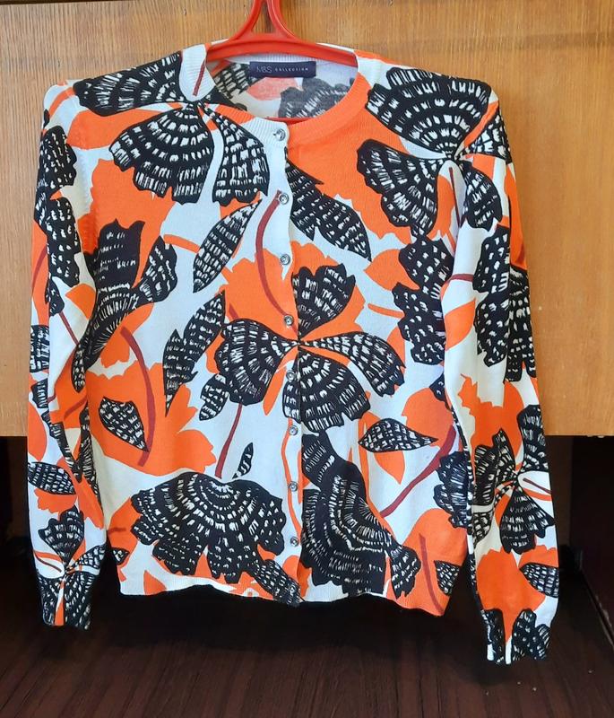 348 Яркая женская кофточка на пуговицах. Состояние очень хорошее. Приятная к телу. Размер M/L. Ширина плечей 39 см Ширина груди 50 см Длина рукава 58 см Длина 54 см.