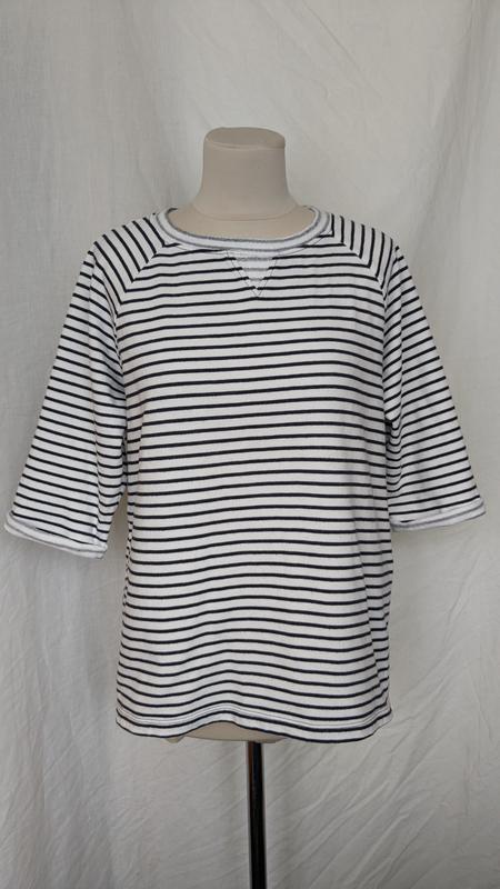 без недостатков цвет: синий, белый состав: 100% хлопок размер: М, (и тем не менее ориентируйтесь по замерам) замеры: длина: перед: 61, спинка: 64 полуобхват комди: 52 длина рукава реглан: от шеи: 42 низ: 54