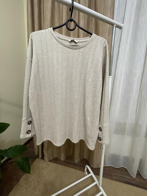 Приятная женская кофтина свободного кроя, цвет светлый беж, контрастные пуговицы на рукавах, красиво сядет на 48-50 размер, состояние очень красивое. Ширина под рукавами 60 см Ширина низу 57 см Длина 60 см Плече 22 см Рукав 40 см