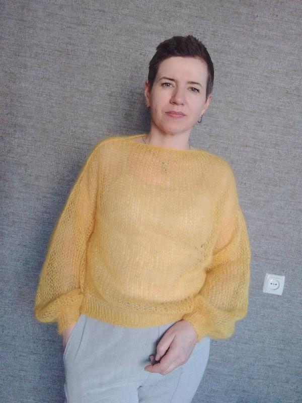 Паутинка из итальянского шелковистого супер-кида Aurora в составе 67% супер кид, 3% меринос, 30% па Бесшовная модель, спущенное плечо, рукав "фонарик" Ручная работа. Длина 51 см, ширина 56 Не колеться Ручная стирка Отправлю по Новой почте каждый день. Укр-почтой кроме воскресенье и понедельника