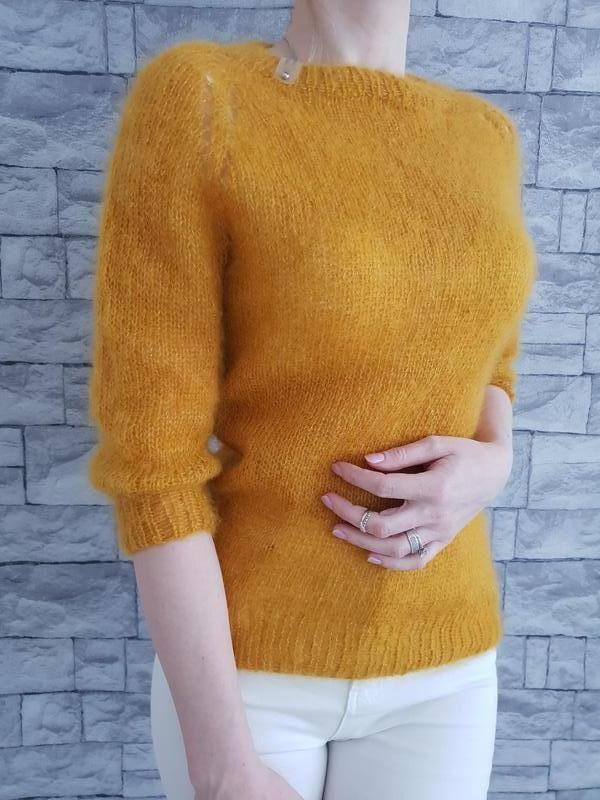 Вязаный джемпер паутинка с укороченым рукавом из итальянского мохера с добавлением люрекса. Пушистое,тонкое,струящееся полотно. Паутинка- это универсальная модель джемпера на любое время года. Можно носить поверх шелкового топа или же на белье. Мягкое полотно, не колется. Приталенный крой. Цвет- золотая горчица. Подойдет на размер XS. Состав: итальянский мохер,люрекс и па. Параметры изделия : ▪ Длина по спинке - 59 см. ▪ Длина от подмышки - 34 см. ▪ Ширина изделия в груди - 38 см. ▪ Длина рукава от подмышки - 21 см. Из-за разных настроек экранов телефона цвета могут передаваться не на все 100% верно.