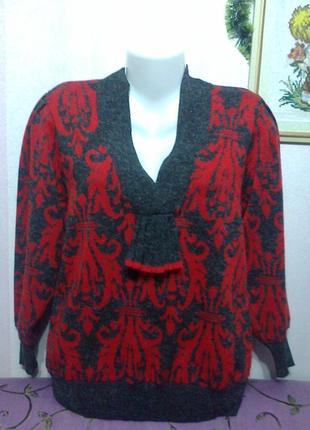 Очень красивый, с насыщенными цветами джемпер. Замеры: Длина - 65 см ПОГ - 50 см Низ - 35-58 см (резинка) Рукав (укороченный) - 59 см Плечо - 10 см
