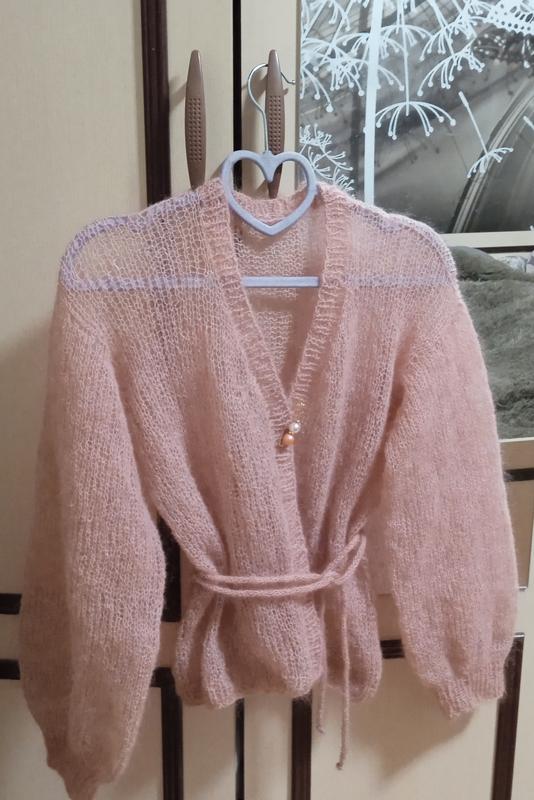 Мохерная кофточка паутинки ручной работы с красивой перламутровой застежкой-булавкой. Тонкая и при этом очень теплая, очень легкая, мягенькая, не колется, немножко пушистая. Состав-Итальянский мкмей мохер (30% кидмохер 28% нейлон 42% па) Замеры на фото, тянется, подойдет на любой размер, от 40 до 48 размера. Украсит ваш гардероб в любимое время года и подойдет под дорогой стиль и одежду, платье, брюки,джинсы... Можно носить в любимое время года, в лету и зимой, на маечке или блузке...Гарно носится, можно стирать. Удобно брать с собой, легкая, теплая и занимает мало места и не мнется. Цвет нежный пудровый беж (пыльная роза). Цвет трудно передать, больше напоминает 2 фото.