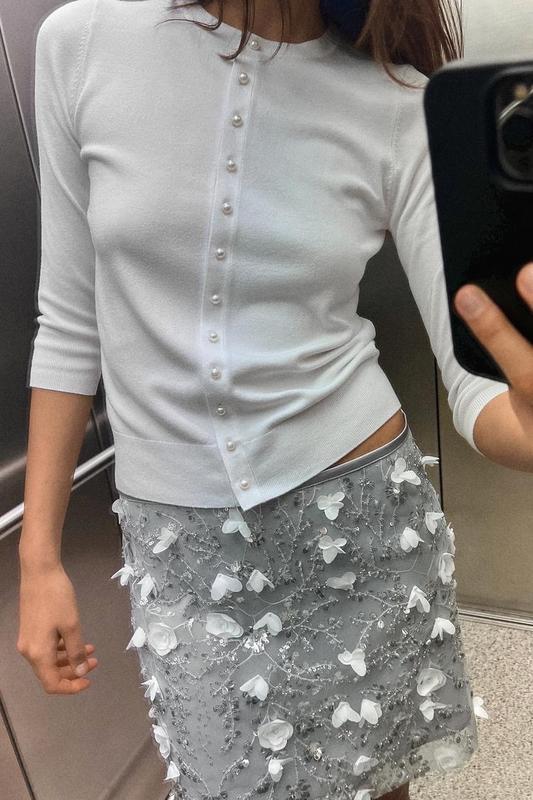 Цена 1580 грн Доставка 4-5 дней🙌🏻 Жакет с круглой горловиной и рукавами ниже локтя. Застежка спереди на жемчужные пуговицы. Белый <unk> 0506/112