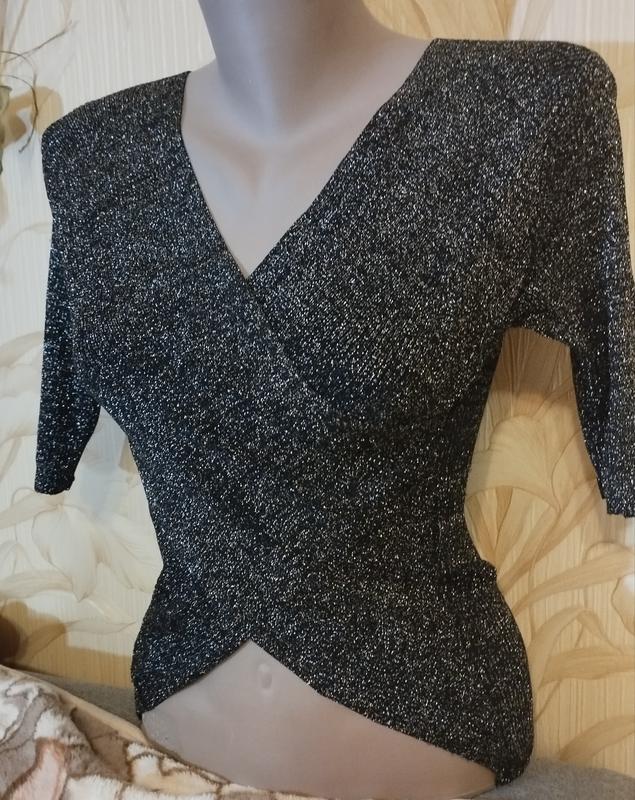 чорна трикотажна кофточка зі сріблястим люрексом.трикотаж м'який добре якості, добре тягнеться. НОГ-40, довжина бічного шва — 33 довжина рукава — 26.торг доречний