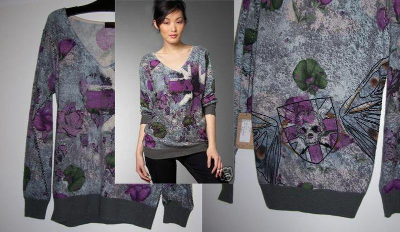 Raw 7 специализируется на нижнем белье и трикотажной одежде из кашемира, шелка и кожи с принтами в стиле панк. Компания была основана в 2003 году. Продукцию этой компании уже выбрали Мадонна, Бен Аффлек, Дженифер Гарнет, Пэрис Хилтон и другие звезды. ++++++++++++++++++++++++++++++++++++++++++++++++++++++++++++++++++++++++++++++++++++++++++++++++ Мало известный у нас бренд и совершенно незаслуженно! Я сама не первый год ношу свитера этой марки.Помимо необычного яркого дизайна они выполнены из кашемира высочайшего качества. В оформлении этого свитера тоже присутствует *черепная*тема-парочка контуром исполненных черепушек на рукавах и *череп в бисере*в области поясницы.В целом же расцветка и качество свитера так благородны,что в качестве дополнения к джинсам свитер может себе позволить даже несклонная к озорству в одежде дама.Может как прикол*выходного дня*. Я носила этот свитер с удовольствием, хотя тему поп-культуры в одежде для себя давно исчерпала.И не раз слышала "Свитер у тебя классный!" 100% кашемир.Мягкий ,очень теплый.Супер качество.Швы оверлочены нарочито грубовато,У-образный вырез. Маркировка М,на наш 46,46-48 Длина 59 см, между подмышками 54 см, длина рукава 57 см