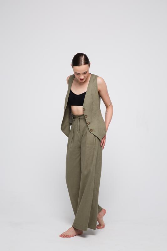 Жилет подовжений | The vest is elongated Цена <unk> Price: 2190Ø <unk> 55976 <unk> 45≈ Материал <unk> Fabric: лен <unk> linen Размеры <unk> Size: XS, S, M, L Штаны палаццо <unk> Palazzo pants Цена <unk> Price: 2490Ø <unk> 63976 <unk> 50≈ Материал <unk> Fabric: лен <unk> linen Размеры <unk> Size: XS, S, M, L