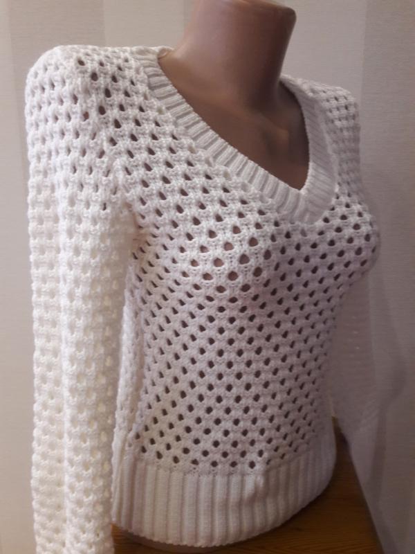 Кофта белеого цвета в сетку ,на поясе и рукавах широкая резинка .Ширина плеч 38см,грудь 40см,длинна 52см,рукав 58см.