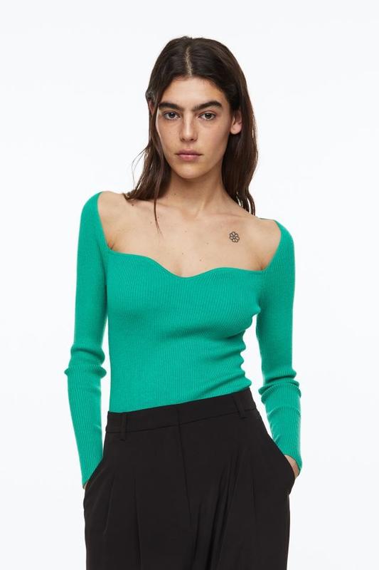 Приталенный топ из мягкого трикотажа в рубчик с вырезом в форме сердца и длинными рукавами. Создает красивый женский силуэт Размер- S Polyester 55%, Viscose 23%, Polyamide 22%