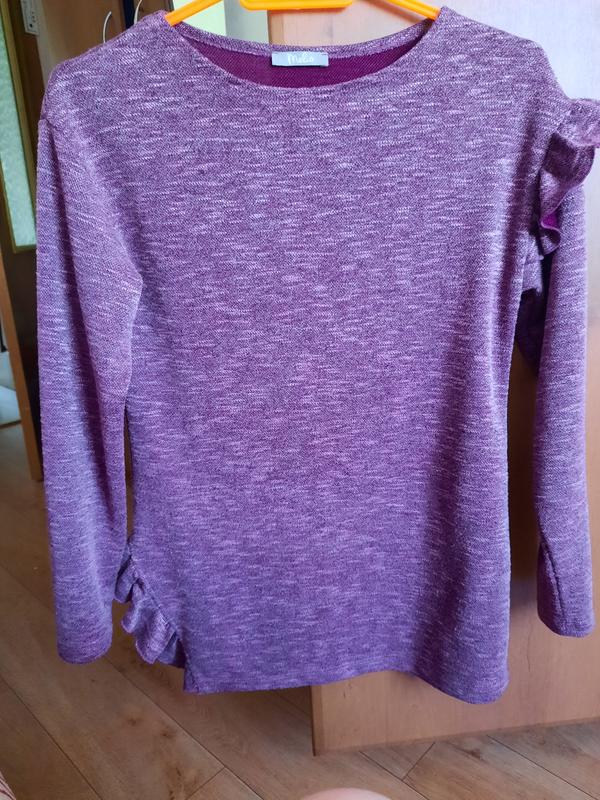 Стильный джемпер с шерстью в составе, состояние нового. Не извлекается, не кашлатится, качество супер. Красивые воланы асимметрия. Цвет как на фото 2 и 4.