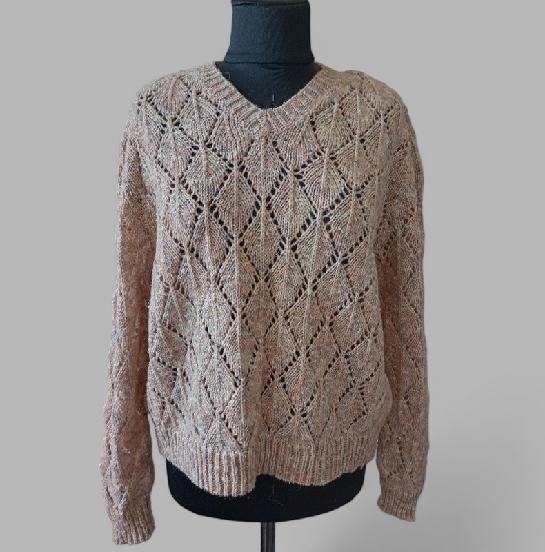 Джемпер связан из меланжевой пряжи с белым вкраплением в состав которой входит: 50% акрила, 40% шерсти, 10% шерсти альпаки. Этот состав пряжи придает изделию теплоизоляционные свойства и легкость, а также мягкость и воздухопроницаемость. Джемпер чуточку "колебится". Размер: длина - 57 см; ширина - 59 см; длина рукава - 62 см; обхват руки - 36 см; плече - 14 см.