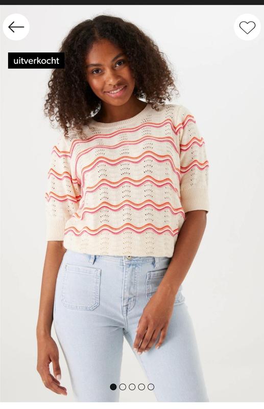 Ажурный джемпер/футболка кремового цвета, полоски - оранжевый и розовый/фуксий, пышный рукав. Размер указан S - сядет свободно, подойдет на M - сядет более по фигуре. Длина от плеча 54 см, Пог 46 см, плечи 36 см, рукав 29 см