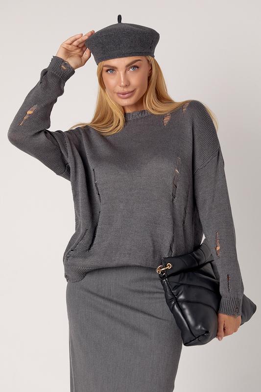 Женский джемпер из машинной вязки с необычным декором в виде вязки с рваными элементами по всему изделию. Проймы в кофте опущенные, круглая горловина дополнена окантовкой. Прямой низ и длинные рукава заканчиваются вязаными манжетами. Размер: One Size Параметры модели: 89*70*95 рост 168; Замеры: ДВ - 62 см, ДР от горловины - 72 см, ДР по внутреннему шву - 45 см, ширина под проймами рукавов - 58 см; Склад ткани: 50% акрил, 50% бавовна Страна: Турция.