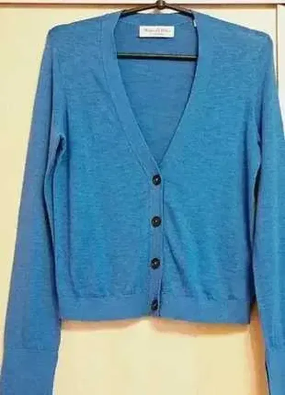 Шикарный жакет, кофта Marc O`Polo, подойдет на размеры S-M, хоть на бирке и написан XS (см.замеры). Очень красивый фиалково-голубой цвет, отличное состояние. Прекрасно садится на фигуру, на манжетах разрезы (см.фото). Замеры: ПОГ- 46 см., ПОТ- 41 см, длина плечевого шва- 11 см., длина рукава по внешнему краю- 65 см., длина рукава по внутреннему краю-50 см., длина по спинке- 55 см., ширина манжета- 10 см.