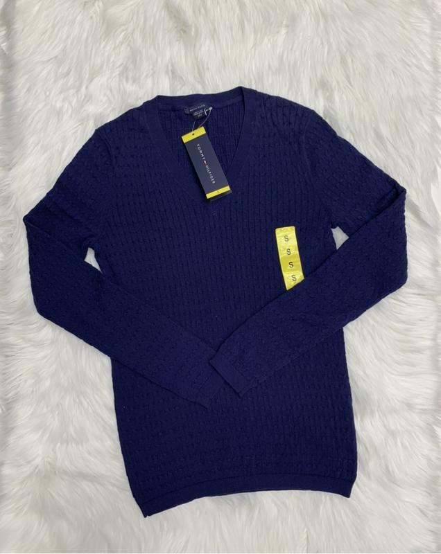 Tommy Hilfiger женский джемпер свитер оригинал, размер S, темно синий цвет. Замеры: объем под рукавом 44 см, спинка 34 см, рукав 65 см, длина 64 см, по талии 40 см. Состав 99% коттон