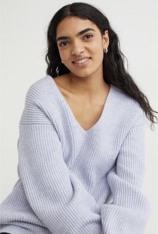 Джемпер из натуральной шерсти в рубчик H&M Джемпер оверсайз из шерстяной трикотажной ткани в рубчик с глубоким V-образным вырезом и заниженными плечами со швами сзади. Длинные широкие рукава с облегающими модными манжетами.