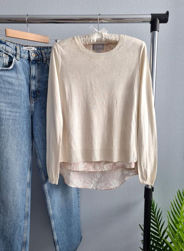 Шелковый джемпер с вшитой блузой. Материал нежный на ощупь. Трикотажний верх - 70% шовк, 30% льон. Блуза по низу - 100% шелк. Цвет кремовый. Рекомендую на рост 160-165. Замеры: полуобхват груди - 44 см полу охват талии - 42 см длина от плеча до конца блузы - 58/64 см рукав - 62 см Состав: трикотажный верх - 70% вискоза, 30% лён блуза - 100% шелк