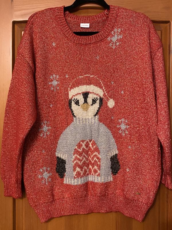 Пуловер красного цвета, цвет не яркий, типа меланж, который создает золотистая нить. На груди изображен пингвин в свитере и шапке. Просто милий джемпер для настрою.склад поліестер в акрил. Размер указан L. Смотрите замеры: НОГрудей 57 см Длина по спинке 67 см Рукав 47 см Плече 22 см - спущене