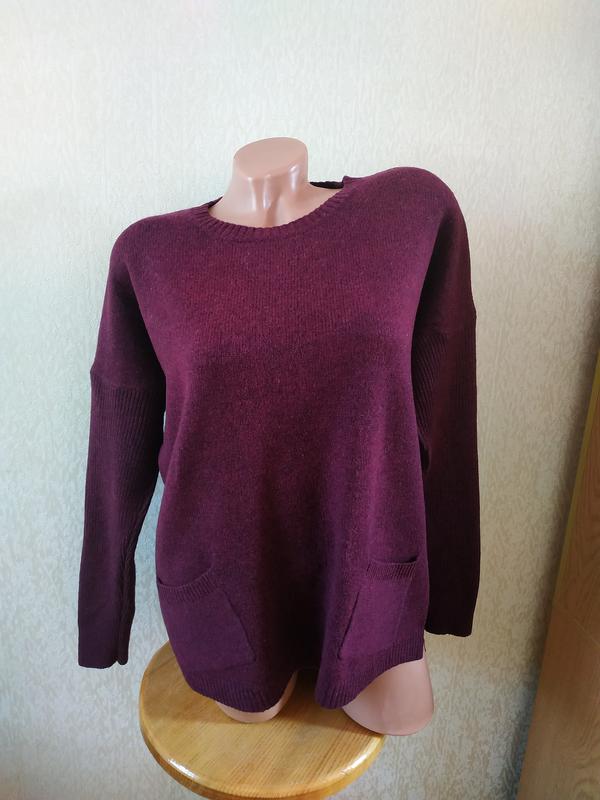 Теплый джемпер темно-бордового меланж цвета, на голое тело колется. Длина от плеча 59 см, спинка длиннее на 2 см, Пог 57 см, плечи 66 см, рукав 43 см
