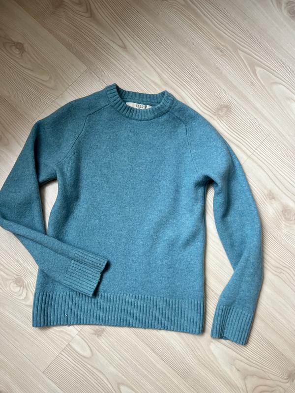Плотный джемпер, приятного голубого цвета. В составе 80% шерсть. Размер указан хс, будет на хс/с. Замеры: длина 53/54, пог 43, рукав от горловины 68
