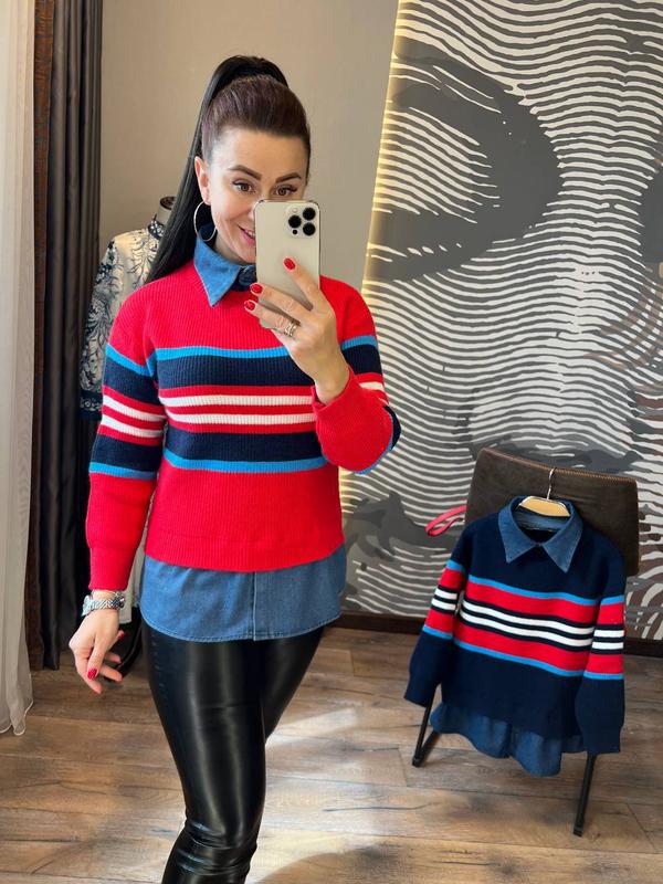 ‼️ОТПРАВЛЕНИЕ ВПРОДОВЖ 2-5 РАБОЧЫХ ДНЕВ!!️ Стильный и актуальный предмет одежды, сочетающий в себе элементы кофты и блузки, создавая впечатление, будто под кофтой одетая блузка. Она имеет вшитые детали, воротничок и нижний край блузки, которые выглядывают из-под кофты, такой стиль идеально подходит для офиса, деловых встреч или повседневного использования. Кофта выполнена из ансамбля двух тканей: трикотажа машинной вязки с очень привлекательным рисунком и темно-синим денимом. Размер единый 42-44. Длина 67-68 см, объем груди 95-96 см по изделию, длина рукава от шеи 55-56 см. код 0600
