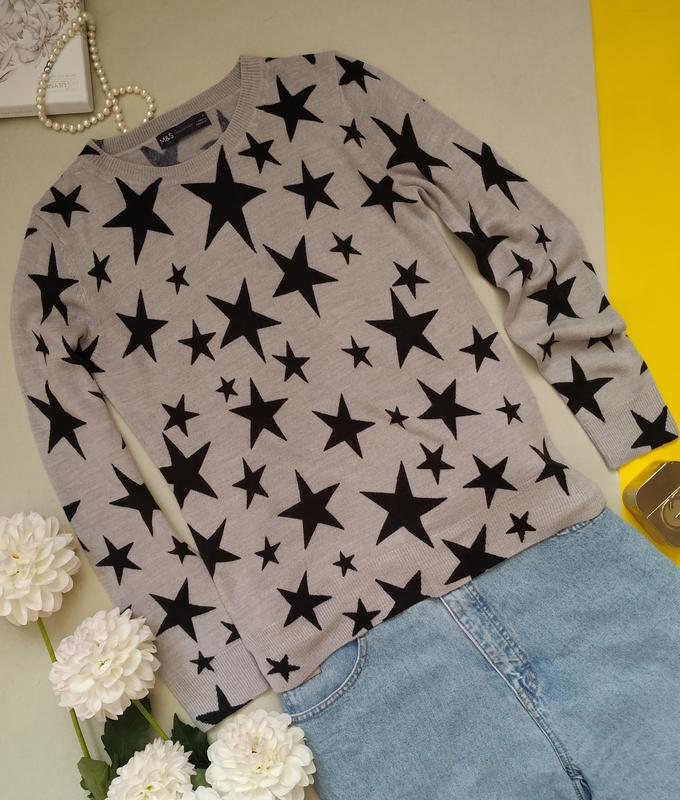 Очень классный серый джемпер со звездочками прямого кроя, удлиненный, мягкий и приятный к телу, тянется, безупречное качество известного английского бренда Размер 6/S Длина 59см Полуобхват груди 44-46см( тянется) Плечи 35см Рукав 62см Стан идеален почти новый, без нюансов