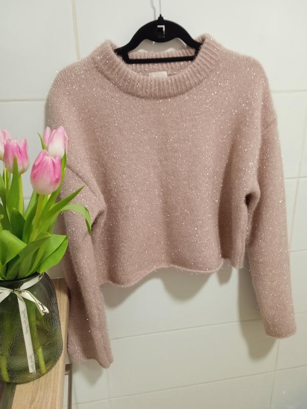 Блискуча кофта від H&M Розмір - М Довжина рукава від шиї - 75 см Довжина кофти - 48 см Обʼєм грудей та талії - 110 см Сайт зʼїдає якість фото, вживу кофтинка ніжно рожевого кольору не бліденька як на фото 💗