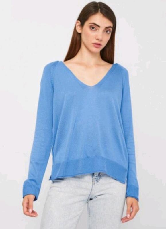 джемпер с V горловиной. цвет ярче и насыщеннее чем на фото. на бирке размер xl, но маломерит, скорее всего на S, смотрите фактические в замеры: рукав реглан, длина от горловины 74см, подмышками 46см, длина по спинке 57см
