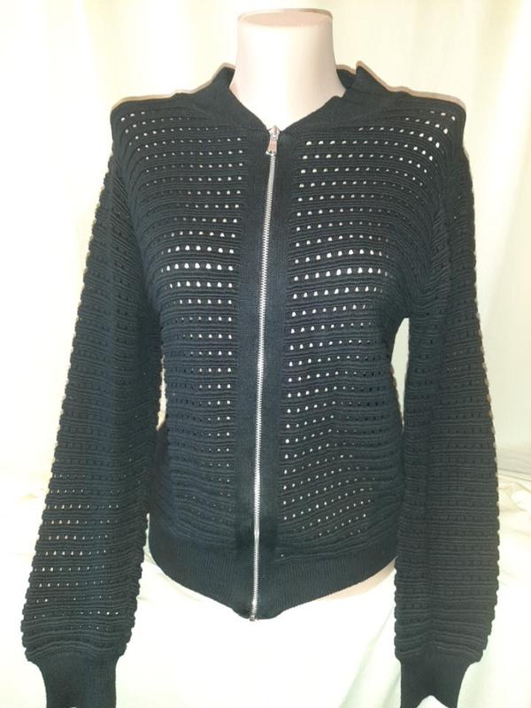 Кофта - бомбер перед и рукава в дырочку, а спинка цельная, указаемый UK 12: ПОГ - 50, рукав на манжете - 58, длина - 58, низ на манжете резинке - 40/47cм