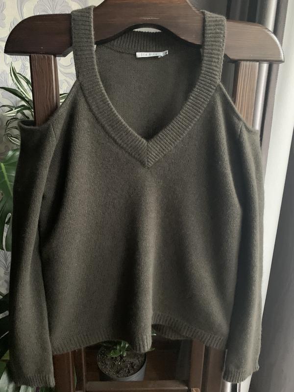 Невероятно мягкий и теплый, уютный и комфортный. Полотно не тонкое, а плотное. Открытые плечи и V-образный вырез горловины подчеркнут женственность и хрупкость. Красивый благородный цвет- смесь серого из хаки. Имеется один нюанс ( последнее фото), в носке не заметен, в цене учитывала. Замеры: ширина в груди 98см, в талии 94см, по низу 100см, длина рукава от горловины 65см, длина изделия 60см.
