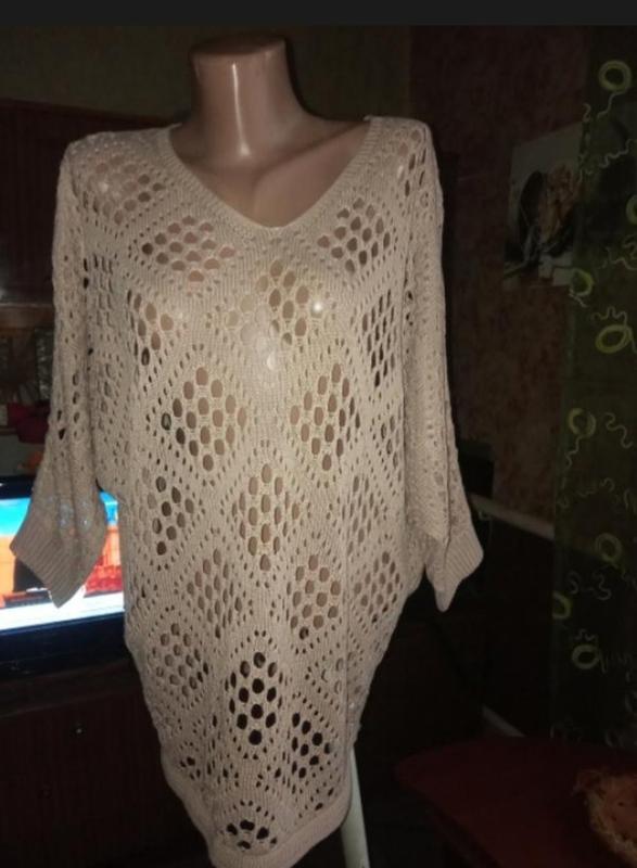 очень приятная к телу кофта, свитерик, джемперок..Ажурный, достаточно нарядный...можно узнать на разного цвета футболки, или майки, или боди, и каждый раз будет новый образ от тепленского с плотной футболкой до сексуального под топ или майку...классно когда джинсы, длинная темная рубашка, а он сверху) Хотим и пишущая на бирке, что полиэстер, однако джемпер очень приятный к телу и совсем не ощущается синтетики.Фасон летающая мышка, к низу немного заужается. подмышками70 внизу50 длина70 рукав от выреза50 очень приятная, нестандартная, нежная вещь, которая комбинируется во множество вариантов) заходите ко мне в Шафу где много интересных вещей🌹🌹🌹