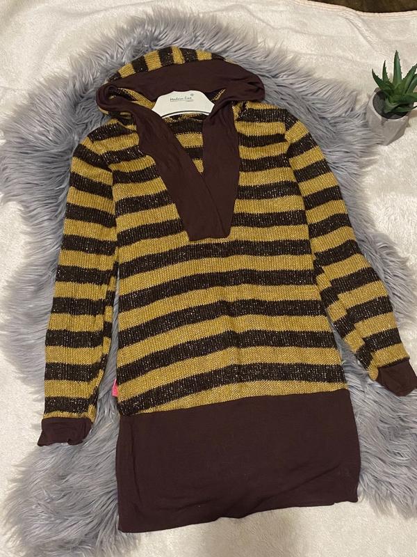 Женский джемпер с капюшоном Вязка нетолстая, немного пушистая как ангора, мягкая, поблескивает золотистым люрексом Вырез на груди, низ рукава и капюшон дополнены мягким трикотажем, также внизу эластичная трикотажная вставка, благодаря которой можно регулировать длину Сбоку маленкая розовая Лейба The First РАЗМЕР на вид 42-46 ЗАМЕРЫ : Чтобы точно определить, подойдет ли вам вещь, сравните с замерами своей одежды наподобие . Замеры даны в спокойном состоянии и умеренно растянутом Ширина (по груди) - 40-42см и еще потянется, так как вырез на груди Ширина (по талии) - 34-40см Ширина (по бедрам) - 36-42см Длина 70см Рукав 54см , плечо 7см