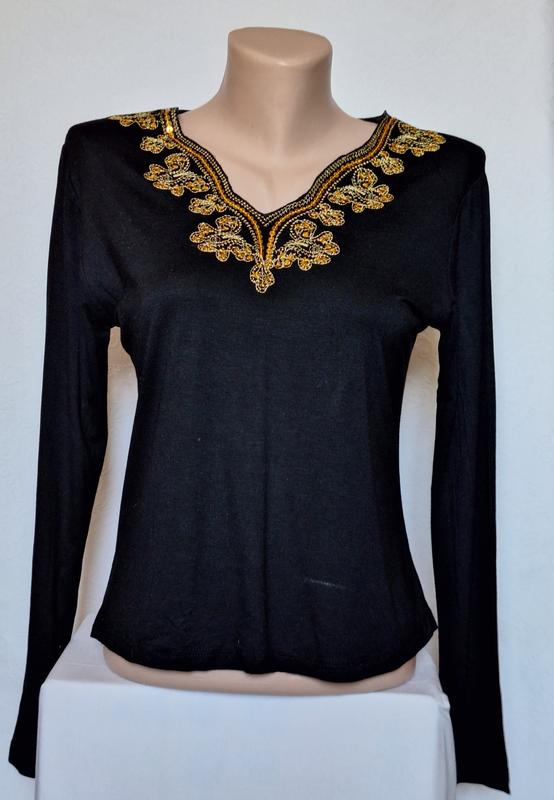 Тоненькая кофточка черного цвета русшита пайетками.ПОГ 48 см, длина по спинке 55 см, длина рукава 57 см. Новая, не ношена.