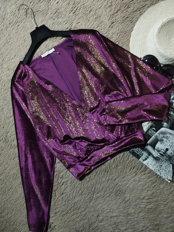 Новый, без бирки. Шикарный бархатный джемпер с блестками на запах. Запах сшит. Ткань средней плотности, тянется. Выглядит супер 😍 Свободного кроя. Размер 8/36/S, но смотрите по замерам Замеры (полуобхват): Груди 55 Талия 35 (тянется до 42) Рукав от горловины 72 Длина от плеча 51