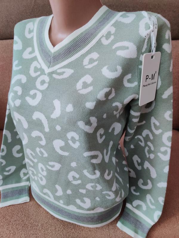 Джемпер с длинным рукавом прекрасно подойдет под брюки, джинсы, юбку. Нежный узор светло-зеленого цвета в сочетании с белым леопардом дополнит ваш модный гардероб! Длина джемпера 56 см, длина рукава 56 см, ширина джемпера 46 см. Вырез горловины V-образный, рукав и низ джемпера оформлен манжетом Арт 3507 Размер 46-48 Цвет зеленый В наличии!