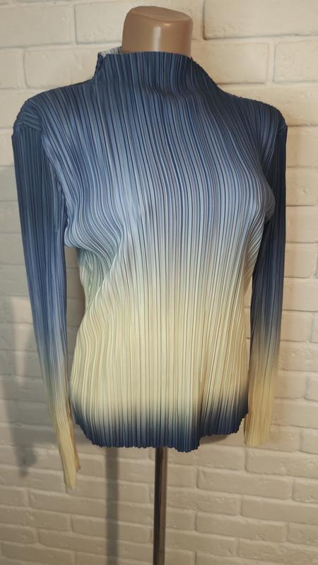 Плиссированный топ с высоким воротником с эффектом омбре цвета желтый и серо-голубой с длинным рукавчиком, состояние новой вещи, размер указан европейский 10, ткань тянется. Замеры НПО груди 43-53 см., длина рукава 58 см., длина топа 57 см.