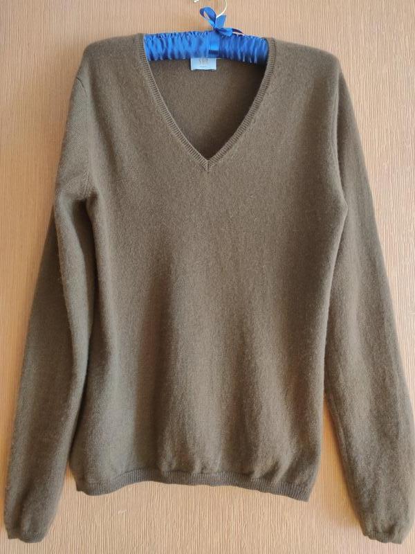 Джемпер из кашемира без дефектов, немного катышков. На локтях декоративные накладки из ткани под замшу. Плечи 40, грудь 46, длина 63, рукав 65, глубина выреза горловины 20