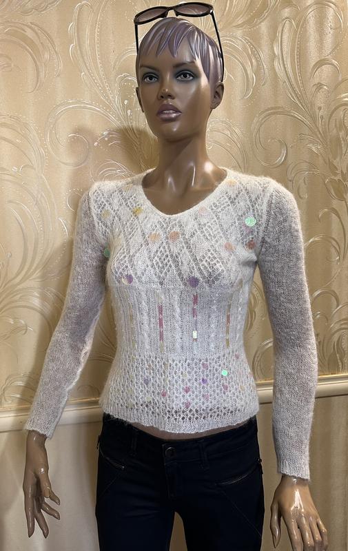 Повітряний джемпер білого кольору з ніжним декором, V-подібним вирізом, прямого, укороченого крою, перед подвійною пряжі, спинка/рукава одинарні. Бренд Cocomaxx Classic. Склад: 60% мохер, 20% шерсть, 20% поліестер. Розмір S. Стан дуже гарний, без дефектів. Заміри: плечі — 35/37 см, НОГ — 42/45 см, ПОниз — 38/46 см, довжина від плеча: перед/подвійна довжина верхньої частини — 52 см, зад — 49 см, довжина рукава: зовнішня від плеча — 58 см, внутрішня від пахви — 45 см. Ласкаво просимо до нашого магазину. Відомі бренди, чудова якість — доступні ціни. Умови доставки: - До оформлення замовлення уточнюйте про наявність виробу. За оформленим замовленням посилка вирушає після 100% передоплати або накладеною платежею за часткової передоплати; - Без оформлення замовлення посилка відправляється Новою поштою після 100% передоплати на карту Приват або накладеним платежом за часткової передоплати 150. У разі відмови від посилки аванс не повертається, а йде на поштові витрати. Поштові витрати за рахунок покупця; - Всі посилки обов'язково переглядайте в відділеннях пошти! Якщо виникнуть питання стану (наяву дефектів, не зазначених у оголошенні), складайте акт у присутності працівника пошти та обов'язково відправте нам з поштового відділення в листування з Шафою фото дефекту. Якщо Виометрислали посилку — це буде підтвердженням того, що Вам усе підійшло, повернення/обміна немає! Щоб уникнути неприємних ситуацій, чітко дотримуйтесь наших правил!