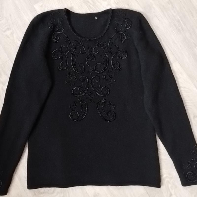 Стан идеален, все бисеринки цели. Очень хороший состав: 70% овечьей шерсти и 20% ангоры. Теплый, но не пушистый, без катышков. Указан размер 14, замеры: пог 48, длина по спине 58, длина рукава 60. Замеры выполнены в нерастянутом состоянии. Тянется