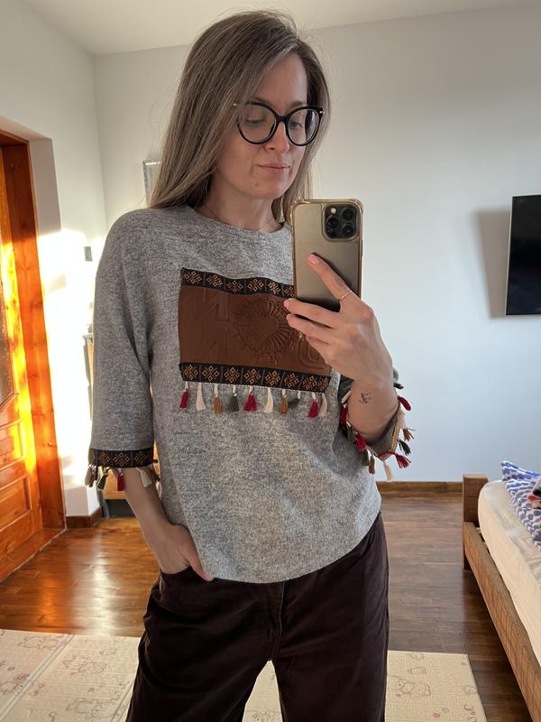 Жіноча кофта з цікавим дизайном Розмір - Л. Також підійде на М Довжина - 57см Півобхват грудей - 50см На фото я, мій розмір М