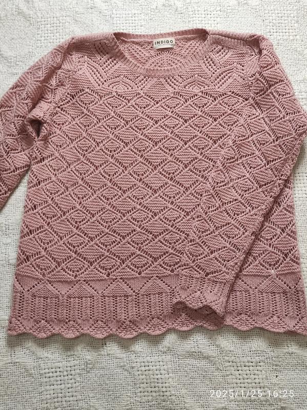Тепленький Джемпер с ажурной вязкой пудрово-розового цвета, на рост 165-167 см.Стан восхитительный, в составе мозер и шерсть(10%) замеры на фото.