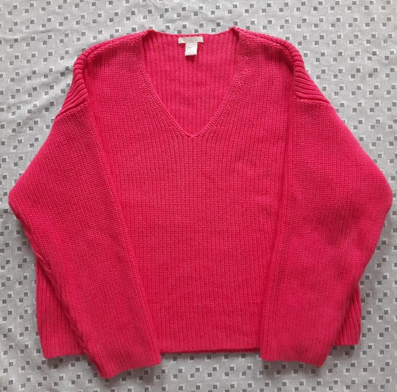 Джемпер с v-образным вырезом Оверсайз из чистого коттона Размер указан М Замеры Длина 60 см Рукав длина 47 см Плечо 18 см Полуобхват груди 58 см. Подойдёт Размер M/ L/ Цвет фуксия