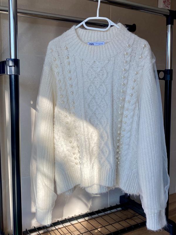 Невероятно красивый джемпер, украшенный жемчужинами. Рукава и спина нашиты фатином, толстая вязка, плотный, добротный в идеальном состоянии. Пог-53, длина-60,рукав-62, плечи-48
